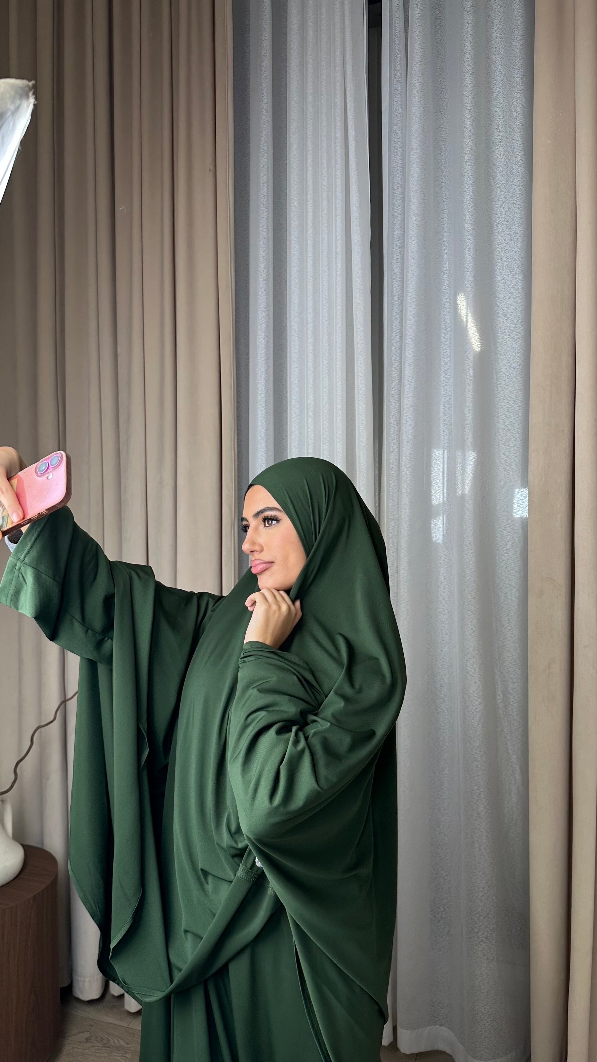 Our premium jersey Khimar & Abaya set combines elegance and modesty. Made from 95% polyester / 5% elastane, it’s soft, lightweight, and stretchy for a beautiful drape perfect for everyday wear, salah, or special occasions.